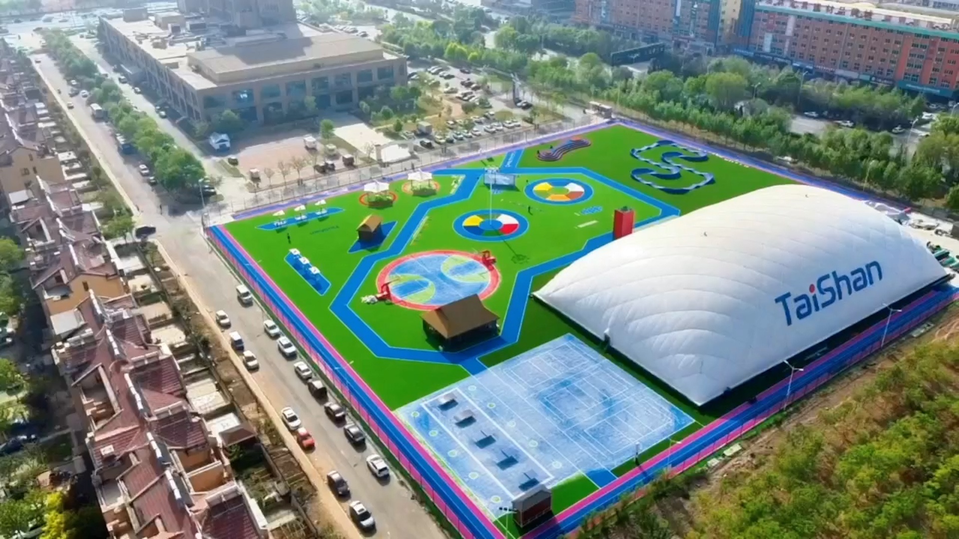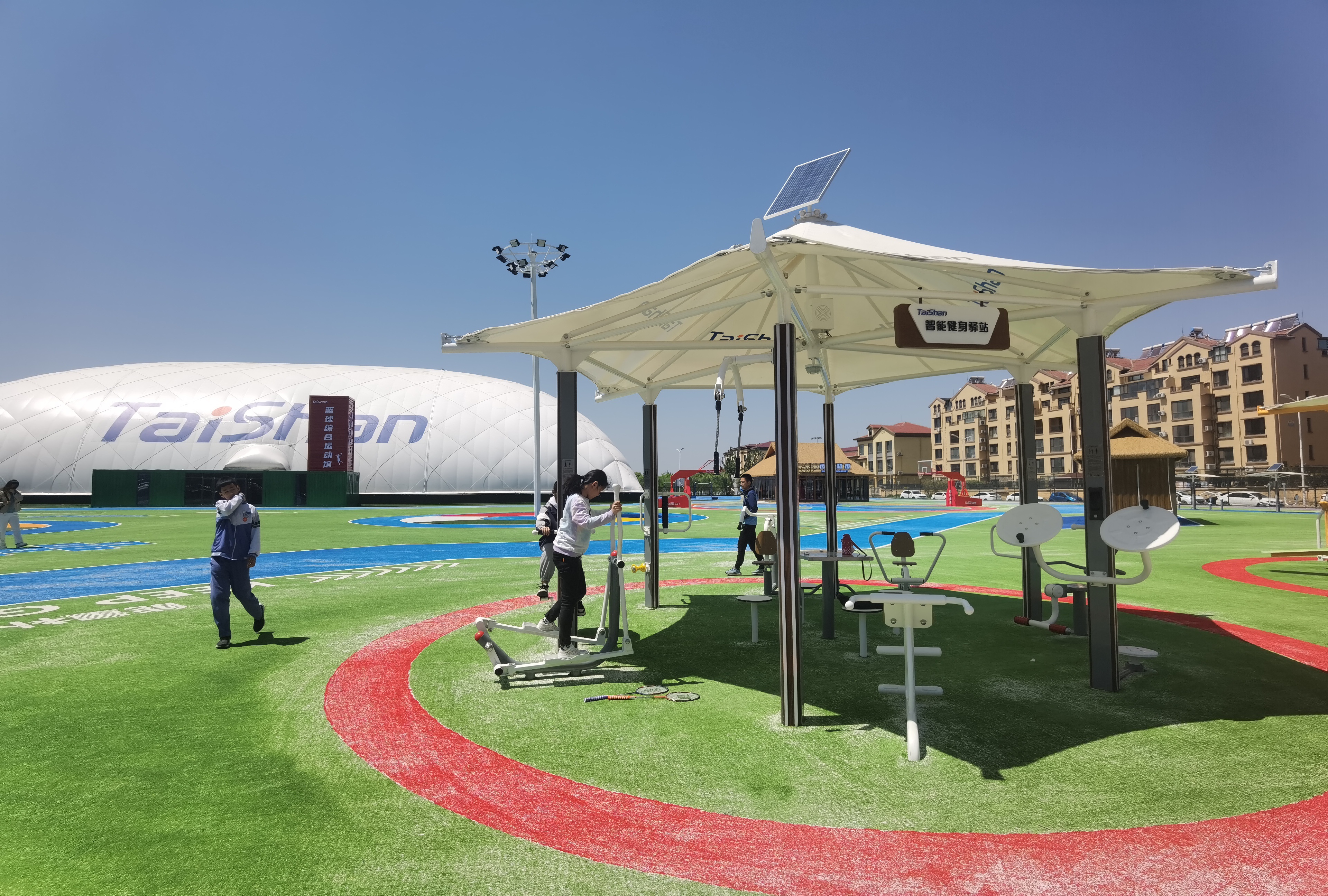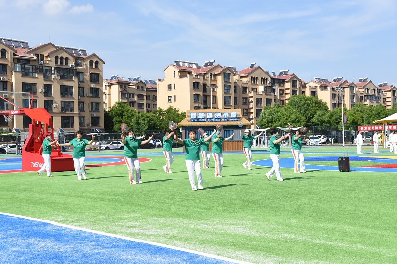 在场地铺设上,均采用星空电竞新材料功能人造草铺设,全方位保证运动安全和环保;气膜式篮球综合运动馆,内部设置2片篮球场、6片乒乓球场地及1片网球场。网球场同时套线4个羽毛球场地。场馆内可以满足体育运动,体育教学及群众比赛需求。从场馆到运动超市、智慧体测小屋,全部采用可装配式建筑。